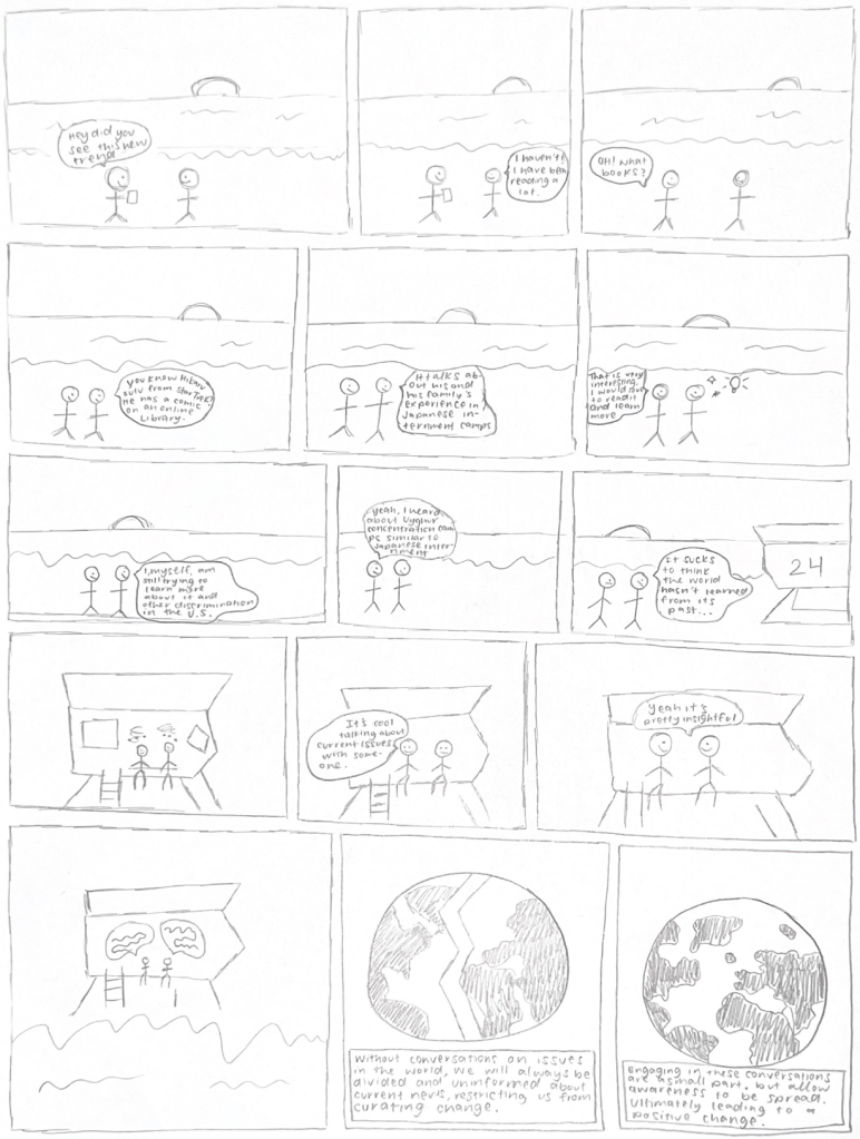 Creating conversations about serious topics allows awareness to be spread. By conversing with family members and friends, ideas will be put out into the world and, hopefully, listened to. It creates depth in an average conversation. Because momentous global issues aren’t commonly existent when talking to family and friends, presenting these topics will create a memorable conversation and directly link that memory to the global issue in need of addressing. It is important to bring these issues into a conversation, but it is also significant to research the topic before spreading information about it. The spread of false information about significant issues can be harmful. Doing research from first-hand experiences like blog posts, interviews, journal entries, poems, and documentaries, is the best way to gain a first-hand perspective about the issue and create an understanding of the people’s emotions and thoughts on the event.