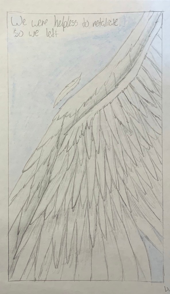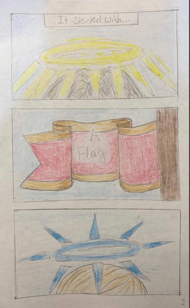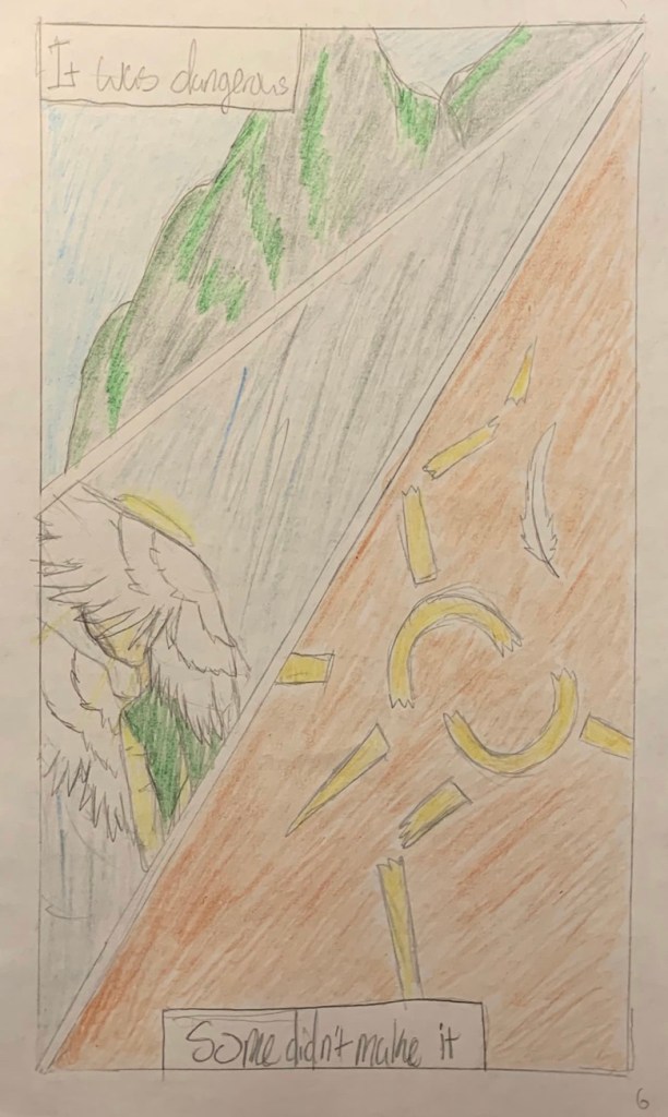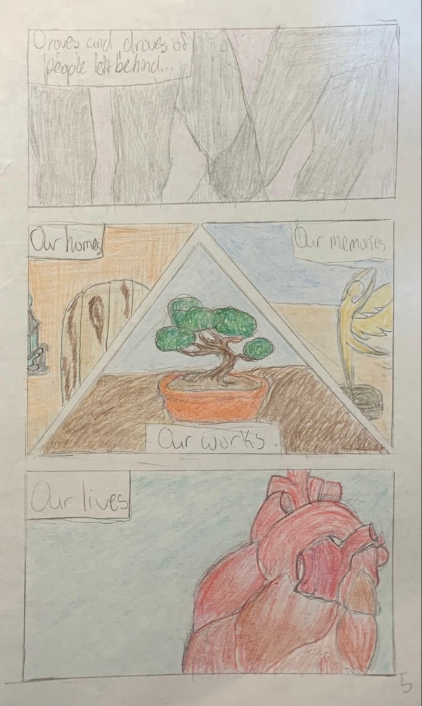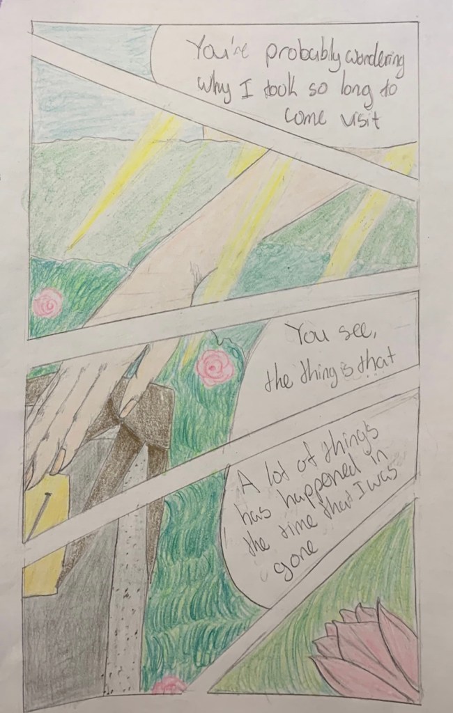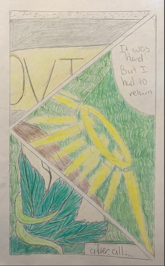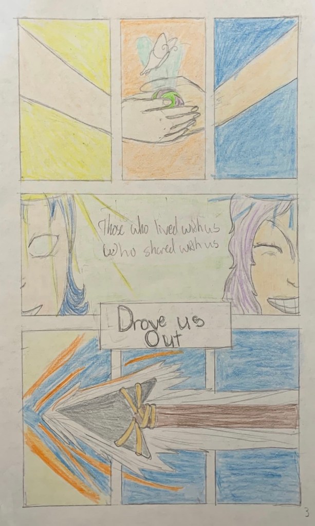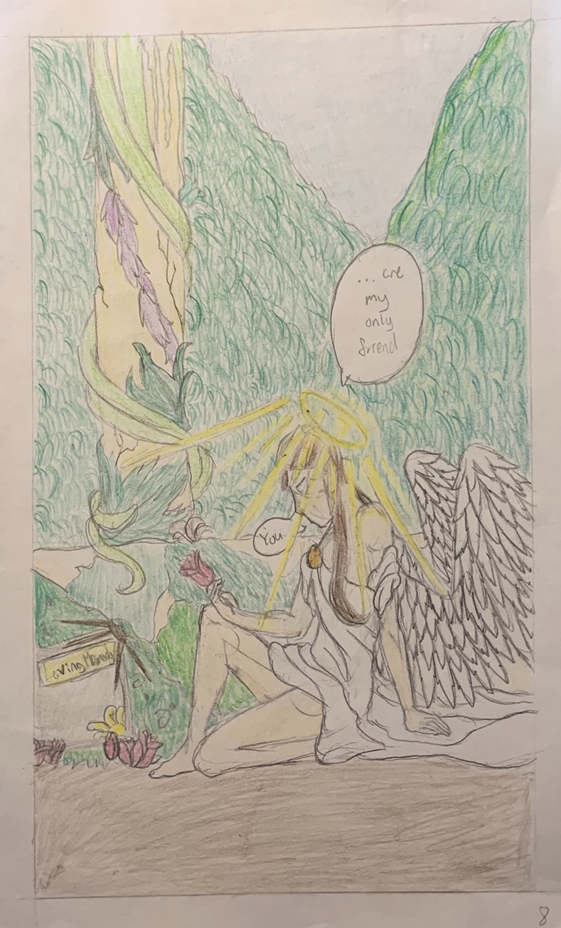 A short, 8-page comic exploring the themes in They Called Us Enemy of losing home and being driven out. With this comic, I tried to incorporate different pencil strokes to create contrast in what would be a monotone scene. This was also an experiment in different comic compositions and formating, I wanted to create mostly snapshot-esque panels to better depict symbols and memories and move the story without disrupting the flow too much. The sequence of events narrated by the character interspersed with close-up shots of the present location is meant to reflect a sort of movie-like setup for the grand reveal of the last panel.