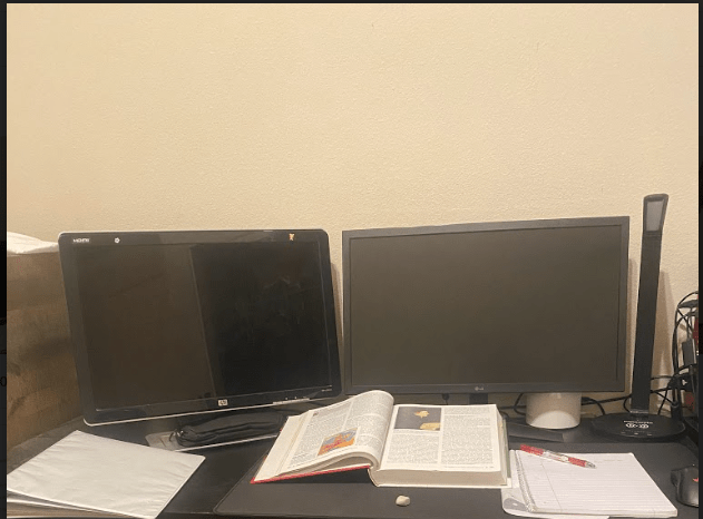 First off, I have my 2 tables, which holds my PC, school supplies, monitors, and headphones. I use two tables to store all of my things (school supplies, PC, etc.) because it helps reduce clutter and mess, which is vital to your mindset when working. If you work in a messy and unorganized environment, it is very easy to get lost in what you are doing. That type of environment can also affect your attitude when working, as a messy environment will only make you dread studying even more. To make it even better, I use two monitors in my setup due to how convenient it is, especially for reading online. When doing homework that requires me to read and answer questions based off the reading, I can just read from one monitor and answer questions on the other, rather than the tedious and annoying alternative that is switching back and forth between tabs. Finally, one of the most important things on my desk is my headphones, as it allows me to listen to music either while I study or when taking a break. It is one of the best ways to refresh my mind and serves as an escape from reality for a little while, which is something that we all need.