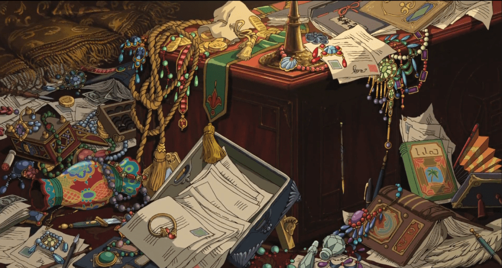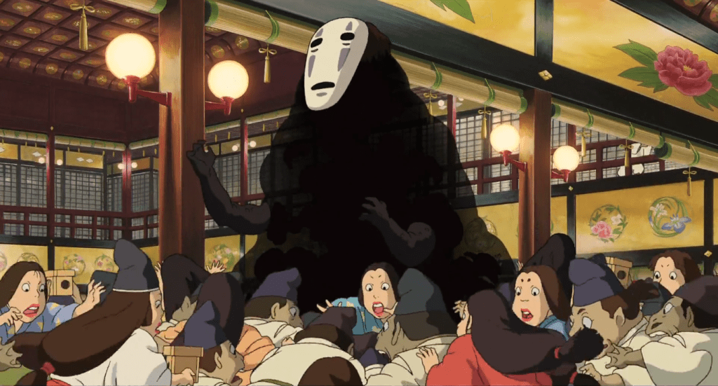 Greed is also shown in the movie Spirited Away. Greed is shown by Yubaba, the bathhouse owner, and the bathhouse workers. The bathhouse reeks of hustling and bustling. People are constantly moving and working, and they make little to no money since they are under contract. Yubaba collects the majority of the money for her own personal gain. As shown in the movie, Yubaba’s room is filled with jewels and she pampers Boh. By this wealth inequality and contract, Yubaba is able to keep them in check, while she gains wealth. However, Yubaba also provides Chihiro with a chance to work and survive, along with some of the other bathhouse workers. The bathhouse workers are also greedy. When No Face asks for a bath, he produces tons of gold for them and they are ready to pamper and do anything for the gold. They’ll fight over it and die over it. While this does show that the bathhouse workers would kill over gold, they are also poor and under slavery. By being greedy, they fill the hole of financial instability and have a chance to escape the bathhouse.