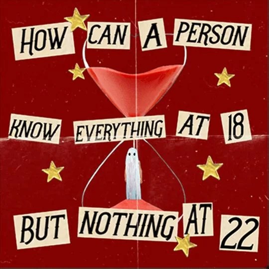 In the chorus, the line “how can a person know everything at eighteen, but nothing at twenty-two” shows how the knowledge of such a young person is always questioned but they are still expected to know everything. This shows how unrealistic standards can be. When one is given something, they are expected to use it but when they do, others will either praise or criticize them.