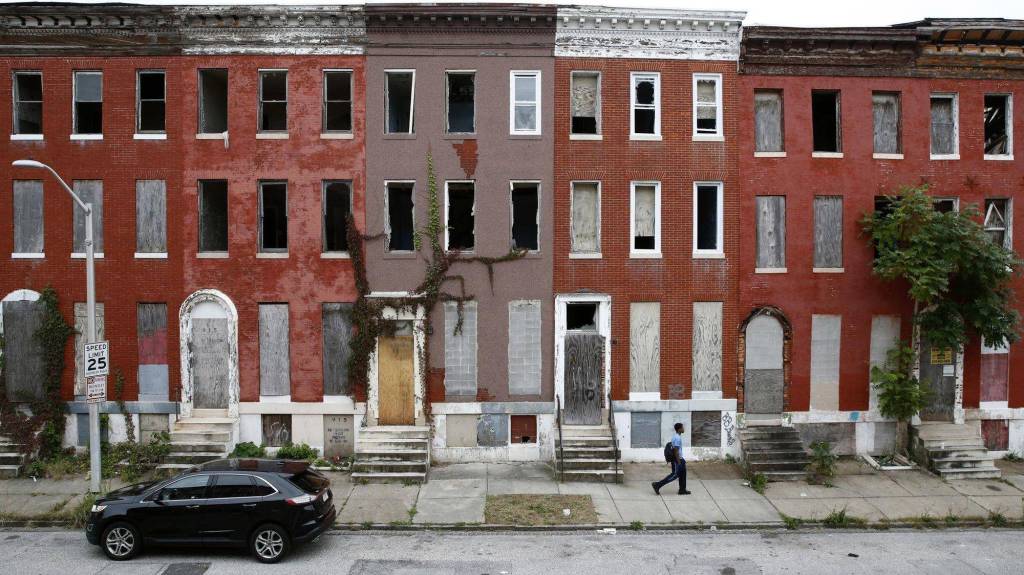 In this Oct. 26, 2018 photo, a man walks past vacant rowhomes in the Harlem Park neighborhood of Baltimore. “There are whole sections of our city that look like 1980’s Beirut,” said Carol Ott, an advocate for tenants’ rights in Baltimore who has helped bring the punishing scope of the decades-old problem to light. (AP Photo/Patrick Semansky)