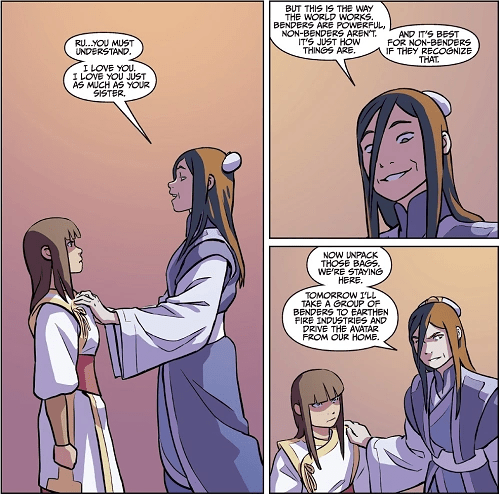 Avatar is a great show and graphic novel to read and watch. It’s not just for kids like many believe; it’s about changing and becoming a better person, learning from the best, and realizing that teamwork and friends are what you can rely on. In this novel, Toph believes that Liling does not deserve her bending powers because of the army she created that only hurts the non-benders. Everyone else, including Aang, believes that she should not have her powers stripped. It is like the same thing as getting your rights taken away, which is unfair to Liling because she doesnt have a say. Although Toph wants her powers to be stripped, everyone has a voice to talk and agree or disagree. Aang decides to persuade Liling to end her harming peacefully without getting her powers stripped. Talking to the person who may be in the wrong is best, instead of acting on your thoughts, because that could lead to many consequences. In my opinion, Aang represents a small percentage of people that would talk and work it out peacefully. Many would act on their thoughts and make the situation worse, depending on their emotions during that time. If you were Toph, what would you do in situations like these? We can clearly relate with all of these people, agreeing and disagreeing. Seeing from other people’s point of views is what makes life, life.