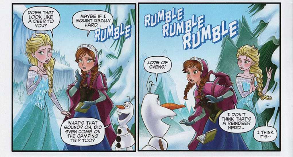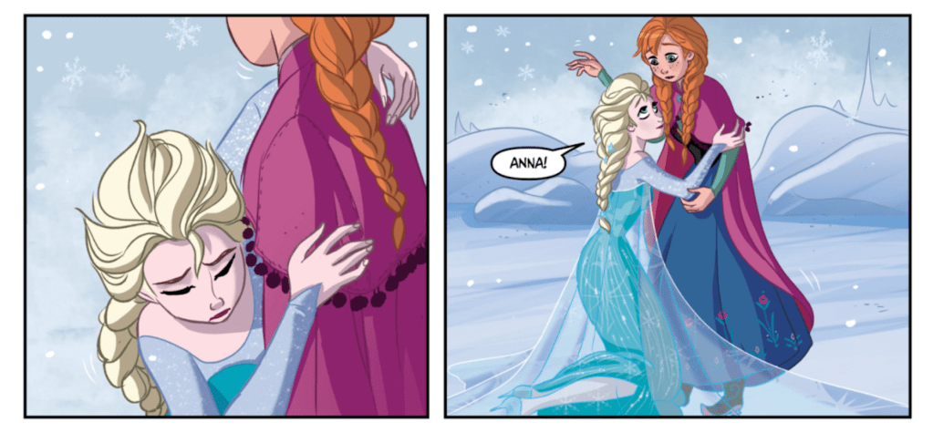 Pathos: Despite Elsa’s ice powers and Annas long journey across the snowy mountains, the story between these two sisters can be relatable in many different ways. Looking past the magical theme of this comic, the tale is based off a bond between family that cannot be broken. While Elsa is having personal issues, her sister Anna goes through endless amounts of trouble to save her. In the end, everyone gets a happy ending. Elsa’s hardships were able to be resolved with the love and compassion from others. As you flip through the pages, you’ll develop empathy for at least one of the characters and hopefully develop a personal connection.