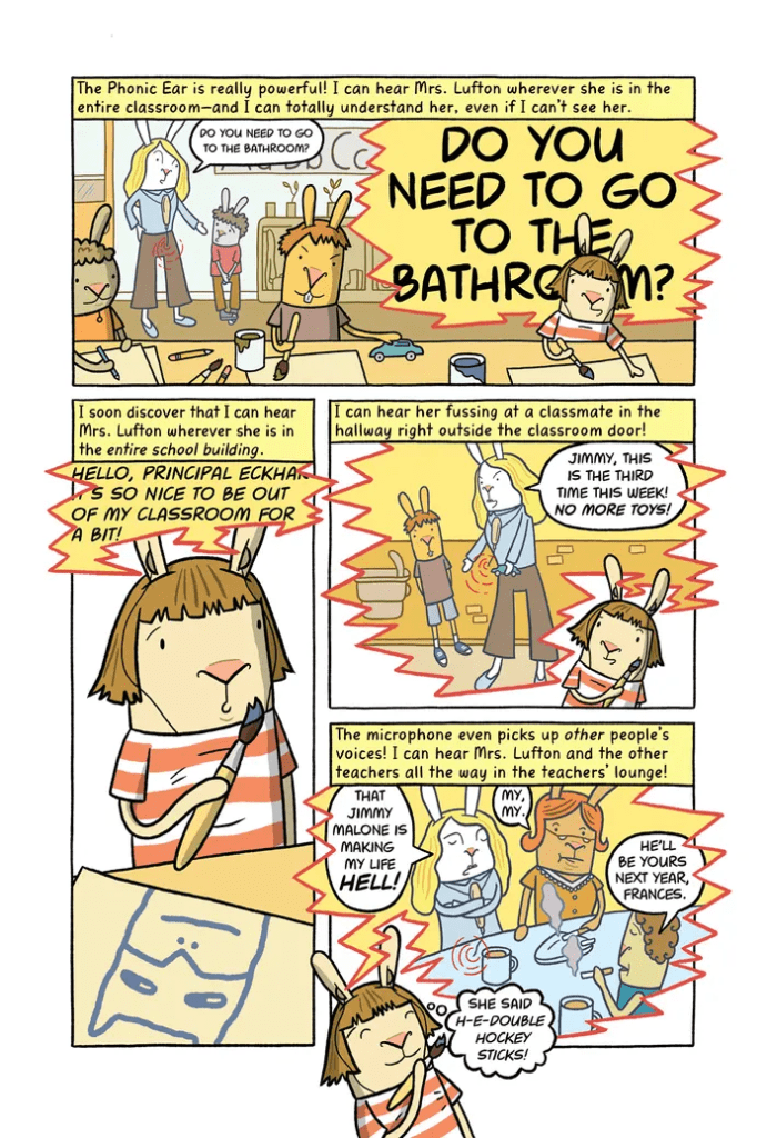 Throughout the comic, the use of Cece’s hearing aids her shown in yellow text bubbles and LARGE AND EXAGGERATED TEXTS. I thought this was cool how the author was able to incorporate the difference between what Cece hears, and the normal white texts of what everyone else is hearing/ saying. These texts are also able emphasize the hardships and annoyances that Cece will experience multiple times throughout the day.