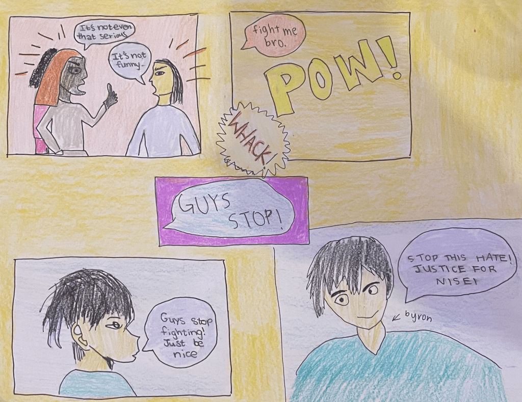 (JOKING/HYPOTHETICAL SITUATION) A story about Monica, a Japanese-Ameican girl, getting bullied by two other girls simply because of her race. When they get into a fight, a boy helps break things up because it’s not fair to be treated differently because of an idiotic stereotype.