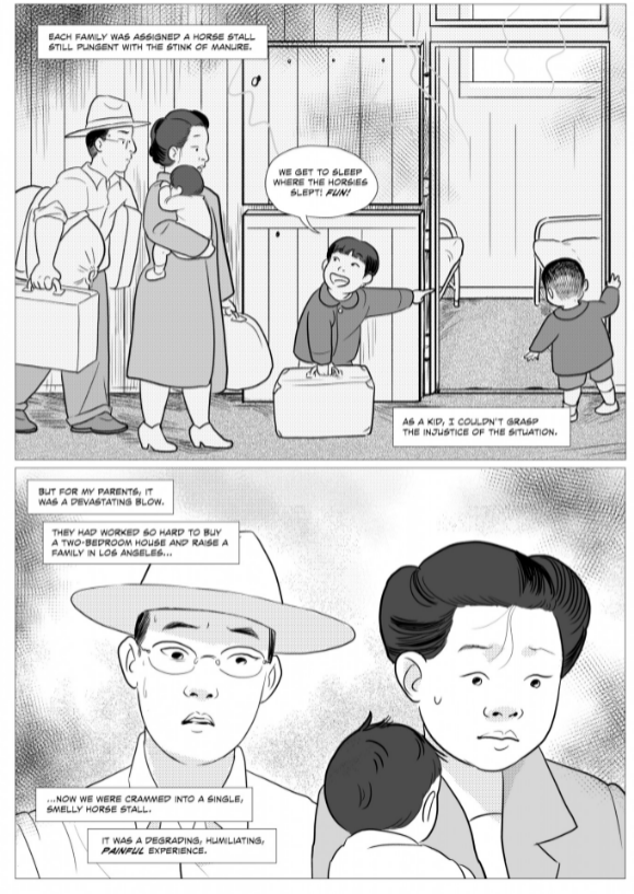 In the panel, the “onion” that we have readers have been “peeling” will show its full rottenness. How Japanese-Americans have been facing discrimination simply just because of their origin, and how they don’t stop to think if they have gone too far. I am confident that going to a house in LA to a horse stall still fresh with dung from horses would have been the most humiliating thing you could experience. Unfortunately, this was a shared experience between Japanese Americans at this time, who were treated no different than prisoners. George’s family were loyal to America and had built a home in America, and without any proof, they had been taken to camps. This action was done without any trial, nor any attempt to prove the innocence of the Japanese-americans. With just a word from the American government, the Japanese would have their lives impacted for years to come.