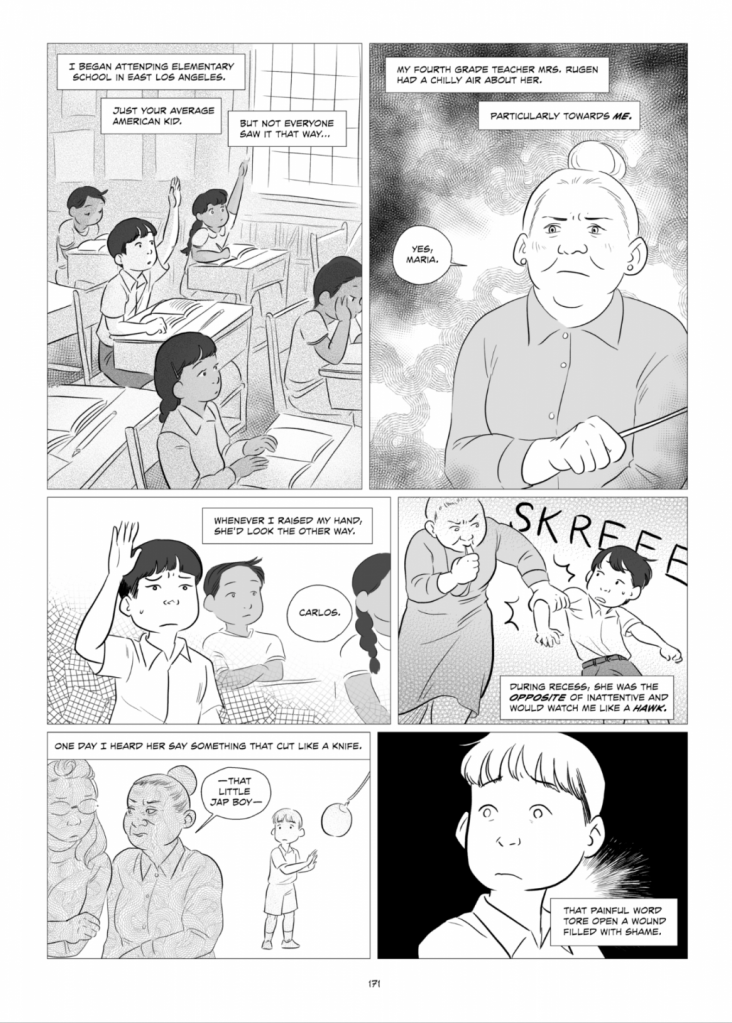 Page 171 of “They Called Us Enemy”, which depicts a normal, common teacher exhibiting racist behaviors.