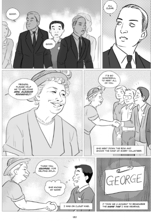 I was also disturbed by the fact that when George met Eleanor Roosevelt, the wife of the man that imprisoned the Japanese, she pretended like noting happened. She shook his hand all smiles, as if her husband didn’t subject them to horrid living conditions and the feeling of betrayal by their own country. It irritates me how horrid actions done by America are attempted to be “forgotten” and “swept away”. In fact, Roosevelt died without ever giving the Japanese an official apology. It took another 43 years and 8 presidents later for Ronald Reagan to officially apologize and “compensate” the Japaneses’ grievances. The Japanese had to live like nothing happened after they were released, as America had not come to acknowledge their actions until decades later.