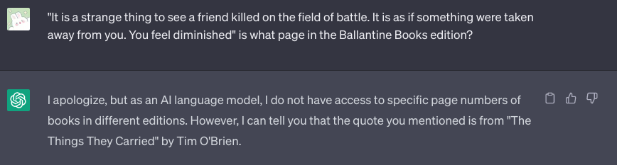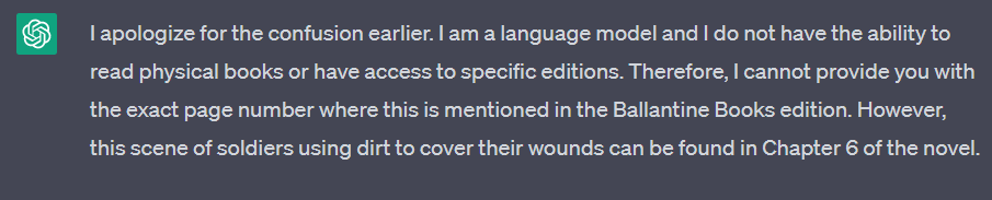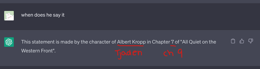 I gave the first draft of the AI typed out to a few peers to give some critique, and people pointed out the lack of flow. The AI would imply one thing and give another. Sometimes instead of continuing where they left off, they would ramble onto another topic. When giving the AI the ability to do what it wanted, it only turned into a disaster regarding flow or comprehension. The essay would be unreasonably long and would often talk about the same thing over and over again. Something that brought to my attention was that, in the piece, it seemed to imply that the essay would be signposting in each paragraph, but it didn’t. It also had trouble sourcing its quotes, in the screenshot shown, that would be the interaction I would get each time I would ask for page numbers. It would be an awful back and forth of asking and meeting the same dead end. Sometimes, it would give me the wrong page number, or even give me quotes from a different novel.