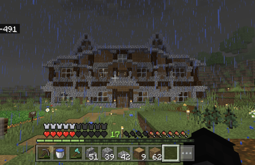 When first playing, only two of my friends could log on at first. We spent the first few nights getting basic tools for defense and running around to find an area that was deemed “base worthy”. We had a few rough patches, a few instances where someone almost dies, and debates over if an area was good enough to settle in. We all did agree on one area eventually, it was near a village and had a vast area to build in. So, we started working on the structure of the house before making it bigger and better. Some were assigned to get materials such as iron and wood to make the game easier since both were essential to making better tools. I was tasked to stay behind and build the house, which I did (and I’m super proud of it).