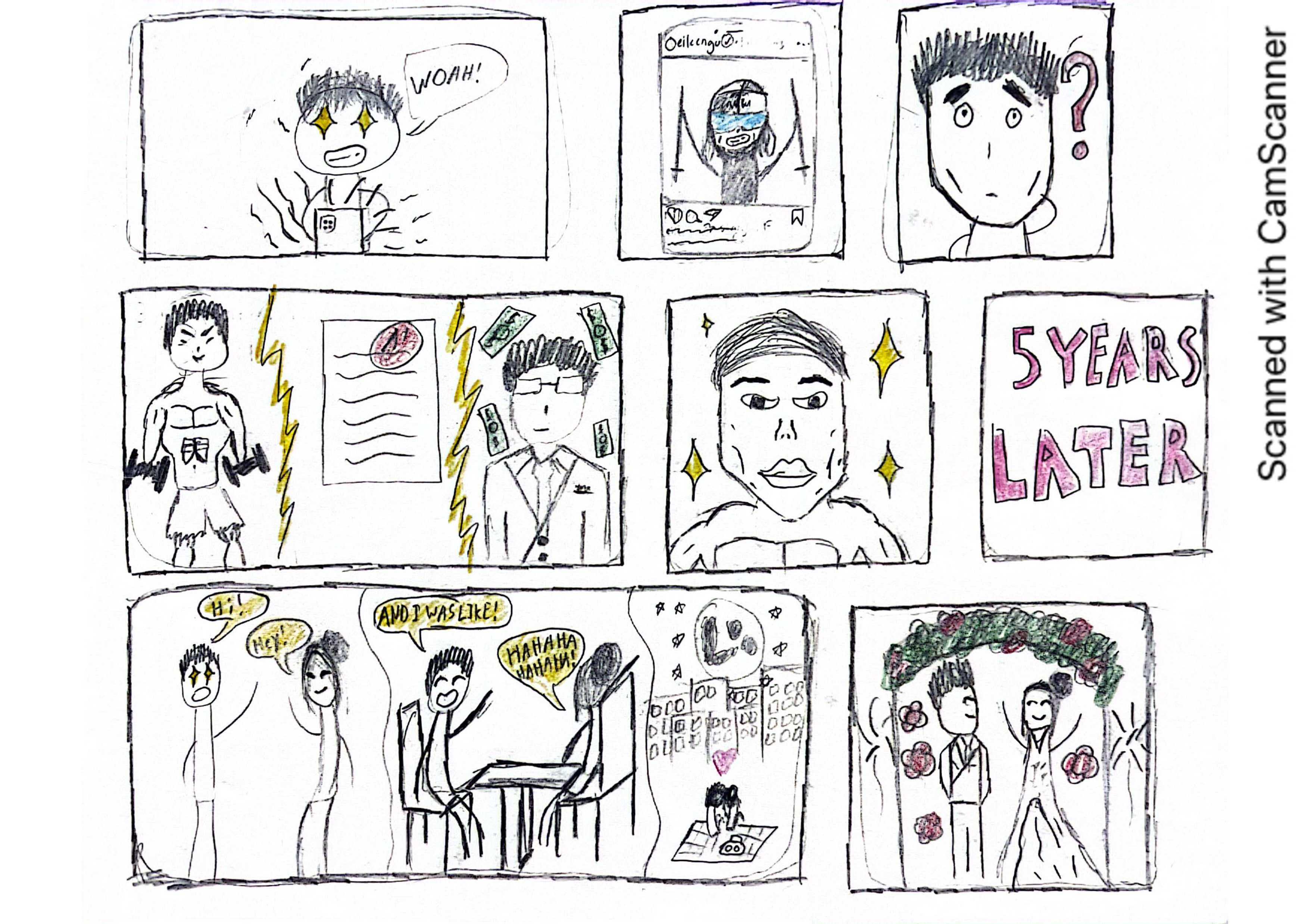 First, dream away; into an existence. Second, make your life a dream. Third, make that dream into a reality. The comic strip represents an individual’s vision; something that seems impossible, but is it? Perhaps, it isn’t the artistic capability of the drawing, rather the creative purpose behind the backstory. Like many others, one can be stripped away from special desires because limited surroundings damn them. However, with no doubt is anything possible. Our humanitarian state succumbs to the social media “delusion”, but never questions why they couldn’t do it either. We hear phrases such as,