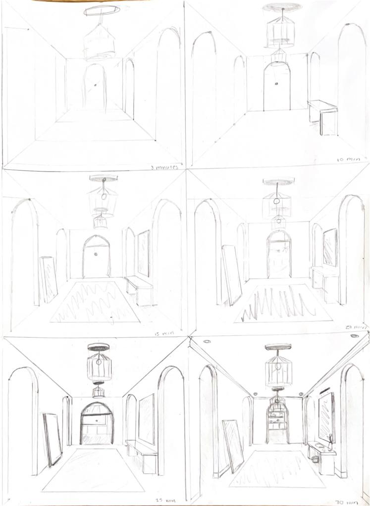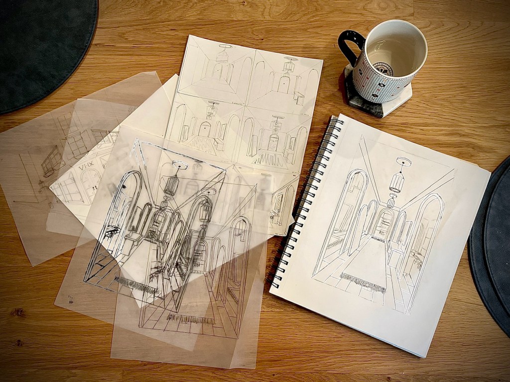 Even though the article itself doesn’t discuss the function of these hallways, it took great inspiration from the concept and got to work. After a little digging, I found an old sketch in a notebook, picturing one of those hallways. That became my reference. It turns out, I had about 10 of the same sketch, sprawled out on several pages of tracing paper.