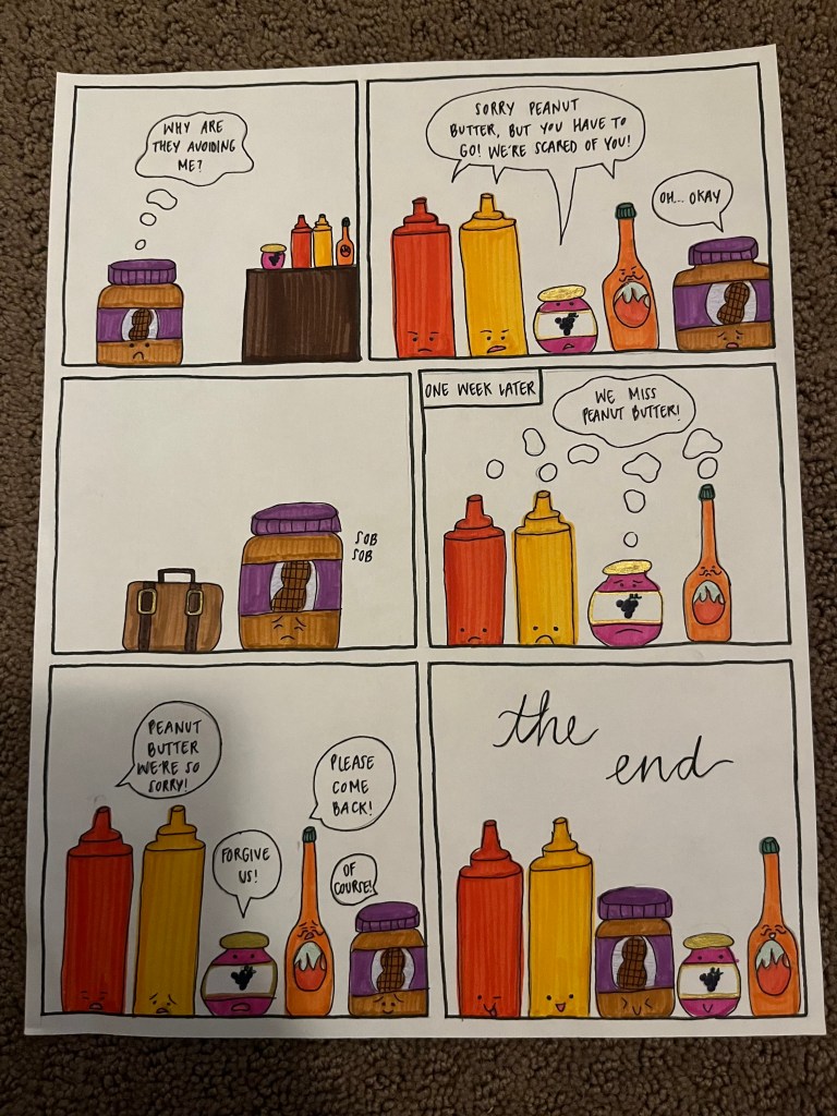 The following comic takes inspiration from the comic They Called Us Enemy and the placing of Japanese citizens in internment camps. The idea that innocent people were being given poor treatment and were being discriminated against is one that is apparent in my own comic as I thought that it was important to highlight the unfairness of these actions. While I created a cartoon comic that has cute and easily understandable characters to help readers acknowledge the story, they still portray the main message. The ultimate takeaway that I would like readers to gain after reading my comic is that one should never jump to conclusions or act on assumptions which can leave others in despair.