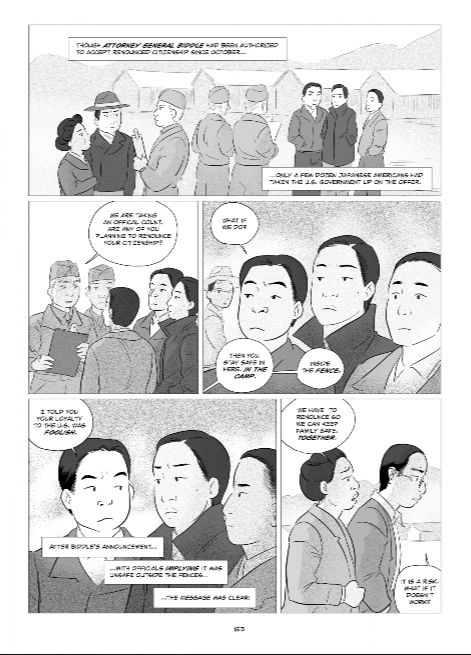 Here is a scene from the graphic novel, “They Called Us Enemy.” American soldiers are questioning the Japanese Americans for their loyalty to America. They Called Us Enemy Pg. 157